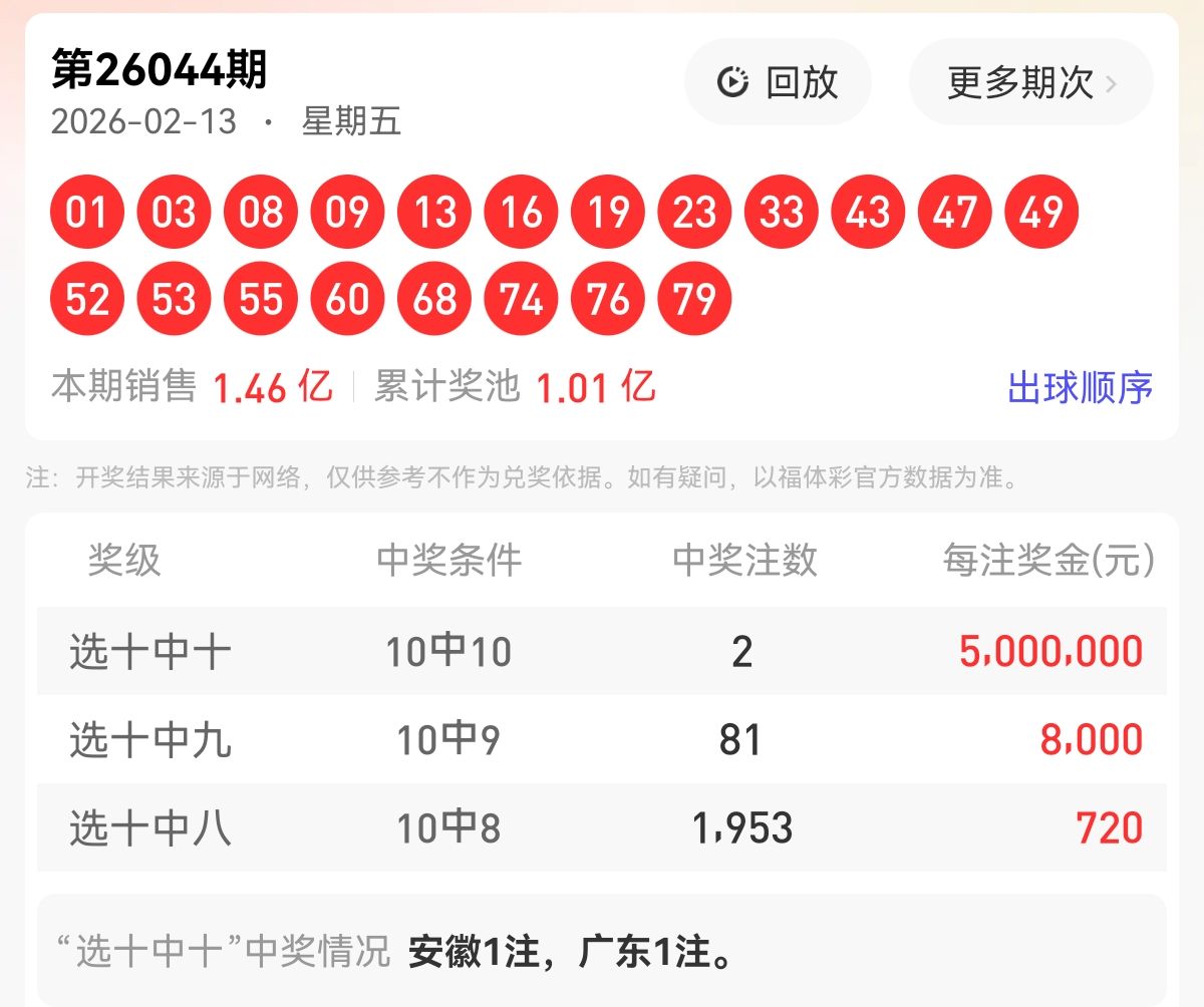 上期福彩快乐8第 2026044期开奖号码为【01 03 08 09 13 16 19 23 33 43 47 49 52 53 55 60 68 74 76 79】,其中大小比11:9,奇偶比为13:7,和值为781,跨度78,四区间比为7:2:7:4。下面是对本期对于每个号码的详细分析。