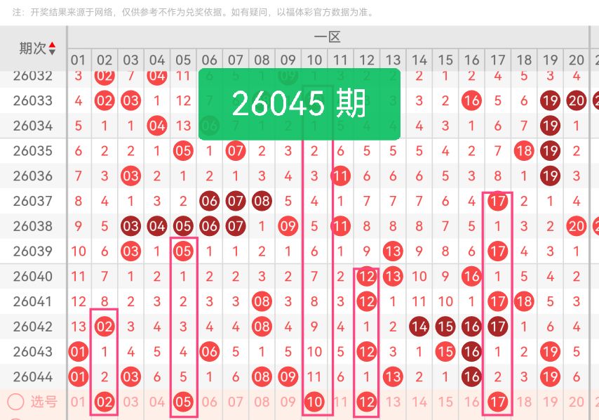 上期第一区间开奖7个号码,本期可能会减少开出。02:我把它放在一区前端,作为小偶数起点,让整个组合有稳定的开头。 05:处在一区中间靠前位置,奇偶平衡感好,和02形成合理间距。 10:是一区中间位置的关键号码,起到承上启下的作用,把前面小号和后面中号连接起来,让整个一区分布不松散,整体感更强。 12:紧跟10之后,保持偶数节奏,号码大小适中,和周围号码形成错落分布,避免扎堆。 17:放在一区尾部,作为一区收尾号码,和前面号码拉开适当距离,覆盖一区后半段,让整个01—20区间从头到尾都有覆盖。