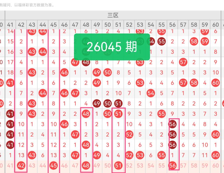 上期第三区间开奖7个号码,本期可能会减少开出。 42:作为三区开头号码,偶数开局,节奏平缓,承接二区尾部,让前半区和中半区连接顺畅,整体不脱节。 45:处在三区正中间位置,起到核心支撑作用,奇偶平衡,让整个三区不会偏轻或偏重,是中间过渡的关键号码。 48:在三区中后段,偶数延续整体节奏,和45形成小间隔。 51:跨过50关口,奇数号码增强组合活力,同时把三区向前半段和后半段连接,让41—60区间更连贯。 56:放在三区尾部,覆盖三区后半段,和前面号码拉开合理间距,让三区从头到尾分布均衡。