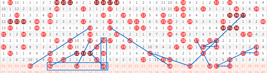 【第一区间1-40】上期开出7个号码。本期分析推荐:05-08-12-16-26-29-32-33-35九个号码。05同路四期和大遗漏10期特别号码;08为同路三期、偶数斜连号码,同时是本期考虑的三重号码;12偶数斜连、三斜连号;16三斜连、三斜连回头及等距三期号码;08-12-16间隔三的偶数号码,是比较常见的出号形态;26同路四期号码,同时看重和倒三角形态;29同路三期、奇数斜连五期号码;32斜连三期号码,和奇数斜连四期的33组成对子落号形态;35需要结合奇数对子(33-35)来看待,两者在此处可能形成的三角形态需要结合划线图看就一目了然,这也是一种比较特别的形态号码。区间推荐重点号码:一小区间08-12-16,二小区间29-33-35。