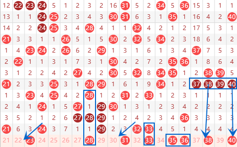 本期我们要注意一下22 23出号情况,重点考虑一下23号数字的出号情况,它是属于空三对称号码,出号机会还是有的。上期开出了连号32 33,那么我们要注意出重的情况,分边的情况我们也是要考虑的,所有本期的31号数字我们也是可以做一下防守的。本期的4连号37 38 39 40应该是要出号了,本期可以大做了,我们重点考虑一下38 40号数字的出号情况就可以了。