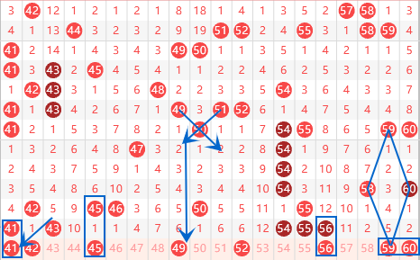 本期的梅花号码42号数字我们也是要注意一下,出号机会还是有的。连号空一带号49 51 53本期应该也是要落号了,我们要重点关注一下,重点考虑一下49 52的出号情况。上期开出了三连号54 55 56,本期我们要注意走重的情况,重点关注一下56号数字,它是属于阶梯式下降重号,出号机会比较大。本期的59号数字我们也是可以防守一下的。注意一下59 60号数字同出的情况。