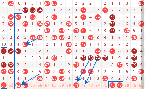 本期的61 62都是重号空一对称号码,本期我们要注意一下落下一个号码的情况。本期的63号数字是属于空4对称号码,可以防守一下。本期的71 72我们要注意一下出一个号码的情况,都是属于斜连对称号码,可以挑一码做一下防守。本期的76号数字我们要注意一下,希望本期能开出来吧。