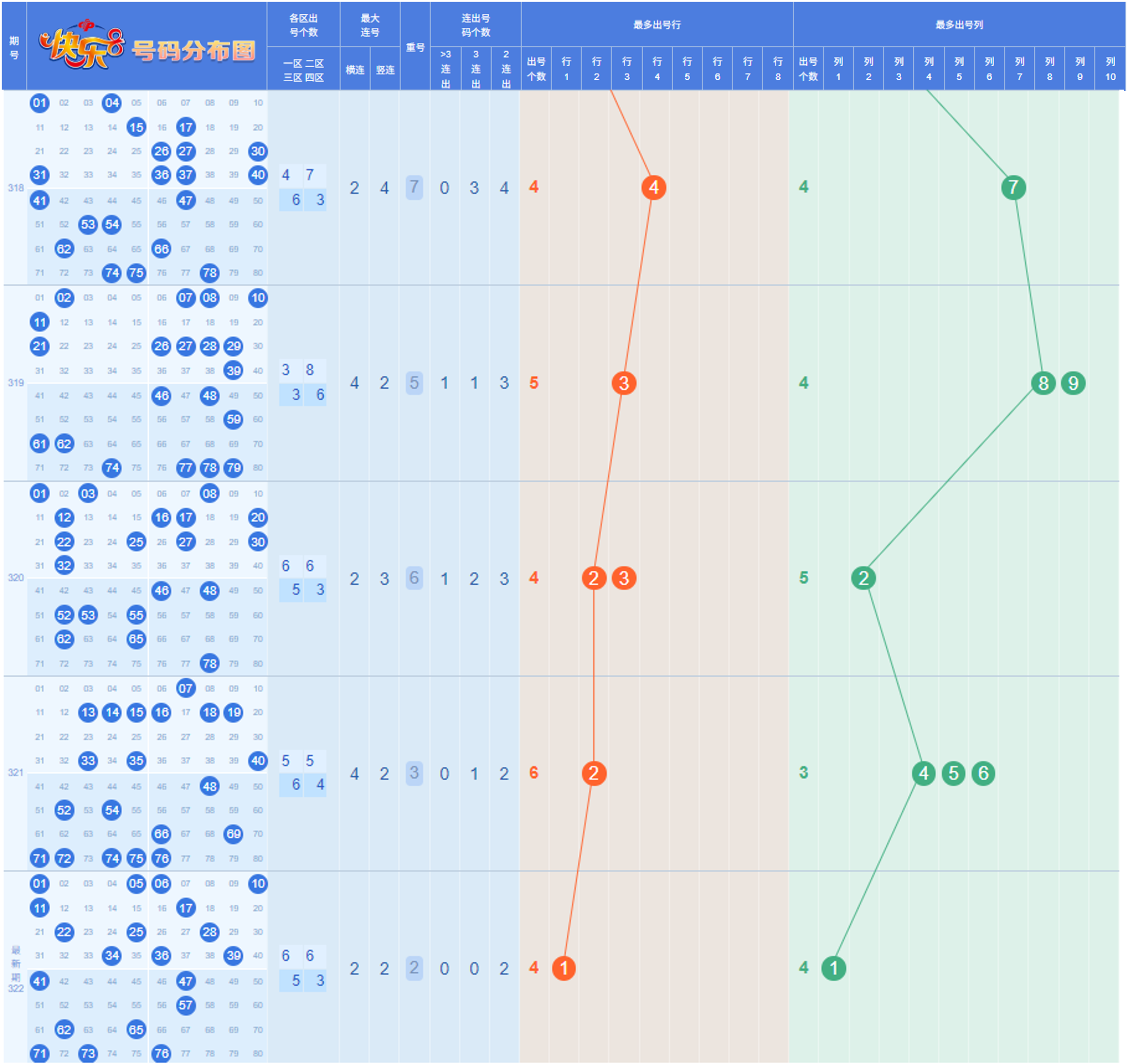 近期走势:连码持续高热,已连续6期开出连码。近5期(322期至318期)每期至少开出2组连码,其中322期开出2组,321期开出5组。
