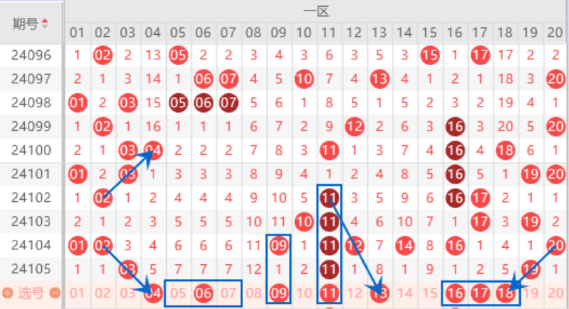 本期的04号数字我们防守一下出号情况,属于02 03 04号数字的三斜连对称号码,出号机会还是有的。本期的05 06 07号数字应该是要出一个号码的,我们重点关注一下06号数字的出哈情况就行了。本期的11号数字我们防守一下出5重号的情况。本期的13号数字是属于遗漏8期的号码,本期遗漏8期的号码有3个,出一个的机会还是有的,我们重点关注一下13号数字的出号情况就行了。本期的17号数字我们可以关注一下,在012路走势图上是属于复制号码,出号机会还是有的。