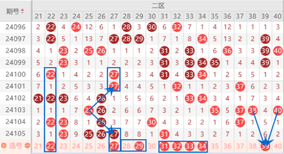 本期的22号数字我们注意一下出号情况,属于空一对称号码。上期开出了25 26 27号数字,本期我们注意一下出重的情况,重点关注一下27号数字出重的情况。本期的33 36 39 40号数字断号2期了,在该区间是属于0路号吗,那么本期出一个号码的机会就很大了,我们重点关注一下33 39号数字出一个号码的情况。本期的32号数字我们注意一下出号情况,属于三斜连对应号码,出号机会还是有的。