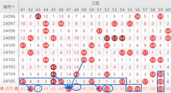 该区间的43 48 52号数字都是属于空三中心号,本期我们要做注意出一个号码的情况,本期的空三中心号有5个,有可能一个不出,有可能出2个。这里我们要注意一下,可以重点关注一下43 52号数字的出号。本期的47号数字是属于三斜连号码,本期我们防守一下出号情况。本期的55 56号数字我们注意出一个号码的情况,本期的56号数字是属于遗漏9期的号码,本期遗漏9期的号码有4个,出一个的机会是很大的,所以本期的56号数字我们可以重点关注一下。本期的59号数字我们防守一下出三重的情况。