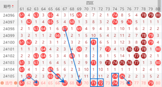 本期的63 67号数字都是属于三斜连号码,我们注意出一个号码的情况,可以重点关注一下63号数字的出号情况。本期的69号数字注意一下,属于大长三斜连。本期的71号数字属于空二对称号码,出号机会还是有的。本期的70 72号数字我们要注意出一个号码了,本期可以重点关注一下72号数字的出号情况。上期开出了74 75号数字,本期我们注意一下出一个重号的情况。本期的73 76 79 80号数字是属于2路号,遗漏2期没有出号码了,本期也是有机会出号的,我们重点关注一下76 79号数字的出号情况就行了。