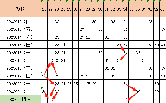 号码22和隔一期开出的21,23形成了一个小三角,这个号码还隔一期和21,23形成了一个来回三角,