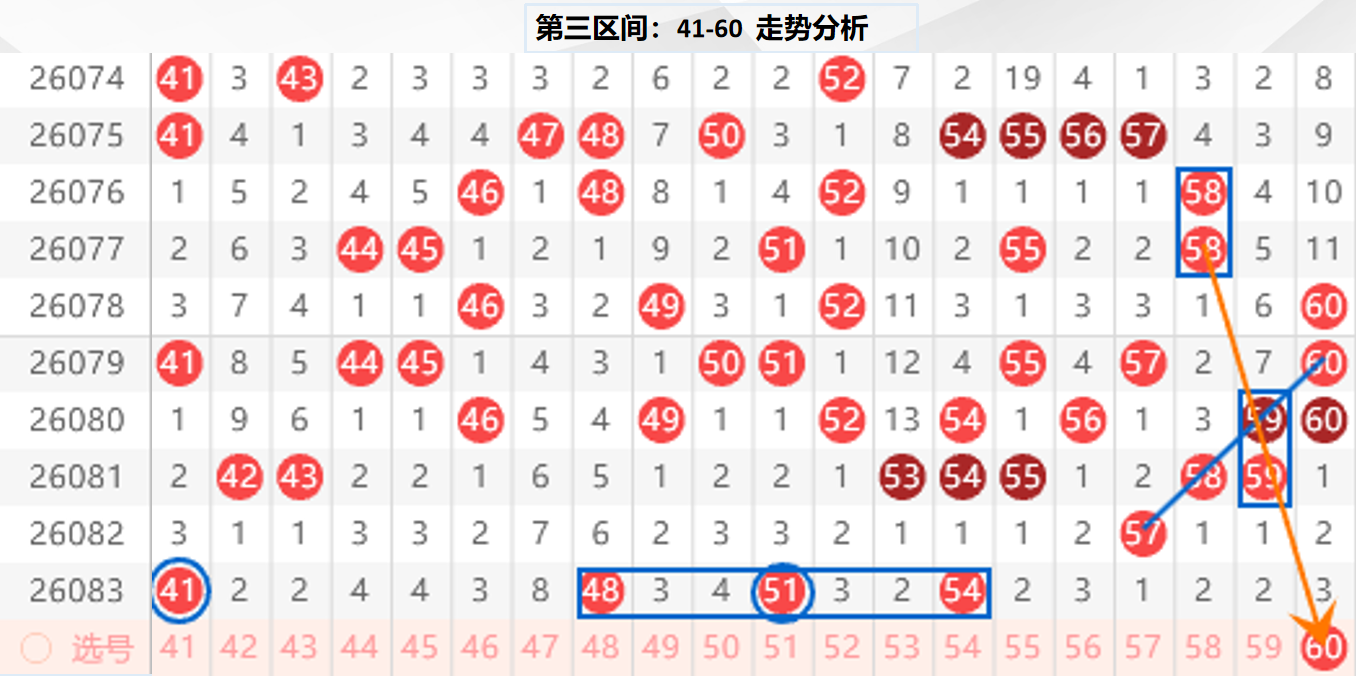 三区分析:【41-60】(走势图标注号码非小黄车大底,请谨慎参考,具体思路将在直播间分享讨论)