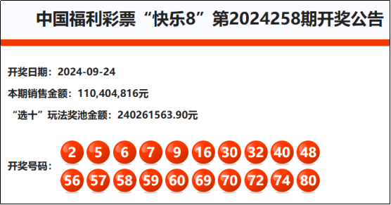 首先我们先来回顾快乐8第2024258期开奖号码: