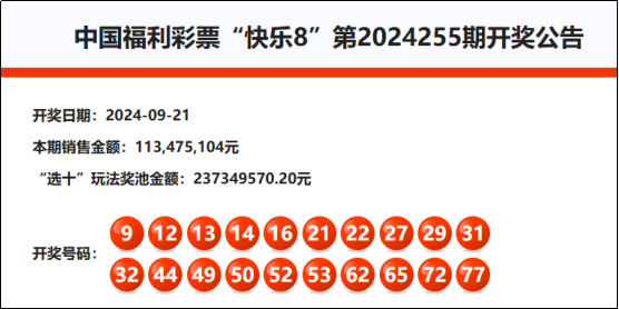 首先我们先来回顾快乐8第2024255期开奖号码: