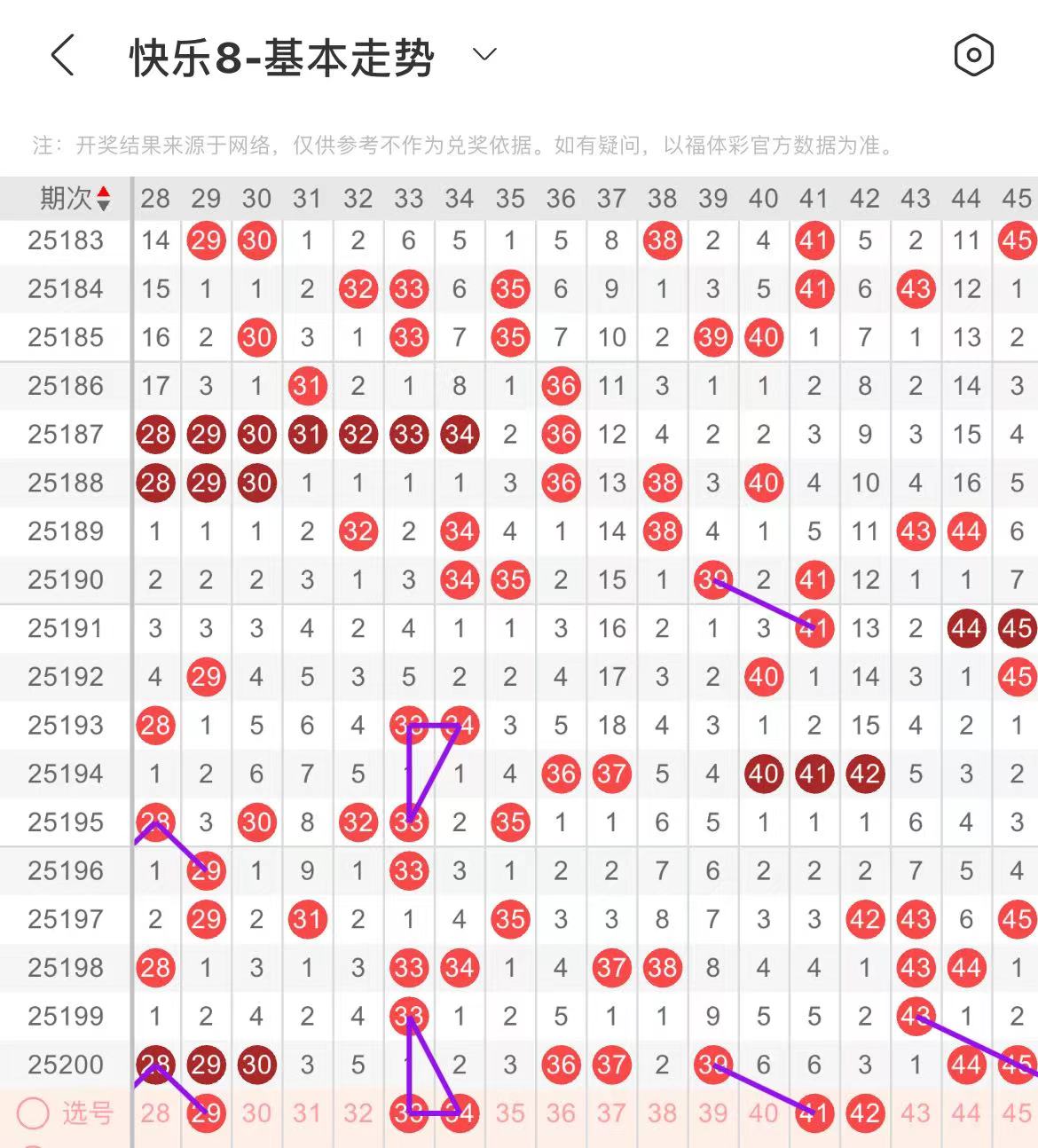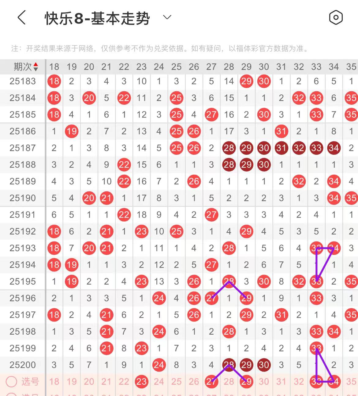 31-40区:本区间上期开出了三个号码,从号码走势图上看,该区出号个数有一定的规律性,本期注意出号个数有所减少。本期有出号走势的号码有33.34号,形成一个三角走势形态。