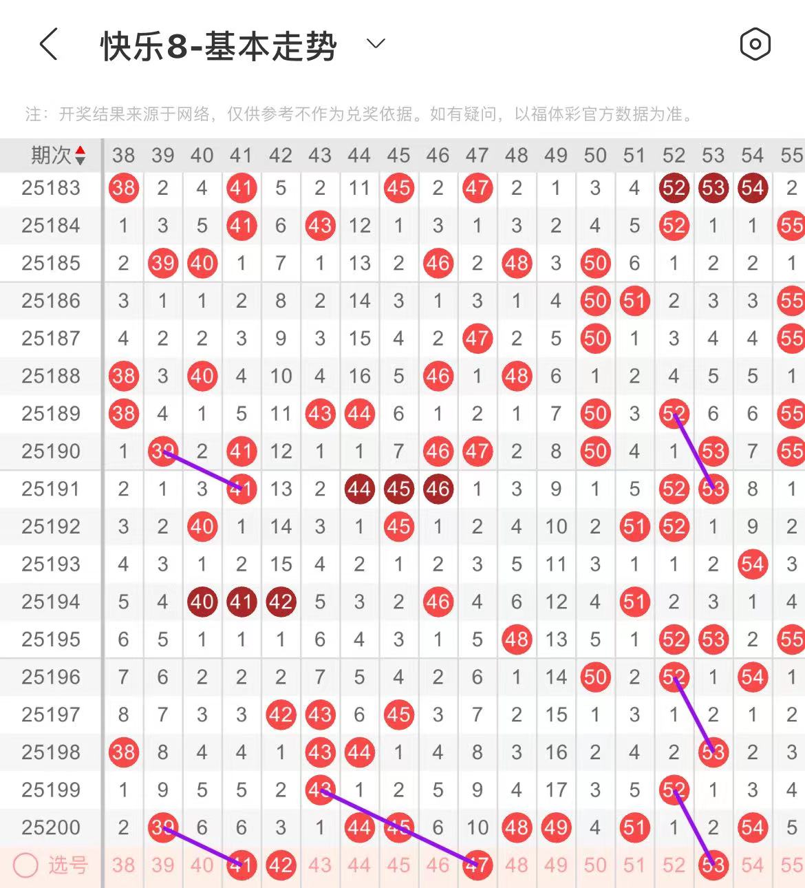 41-50区:本区间上期开出了四个号码,从号码走势图上看,该区号码走势在回暖,本期继续关注该号码回补,出号个数应该在两三个号码之间。本期有出号走势的号码有41号,39对应41出号走势,防41.42同出,47号,斜连出号走势。