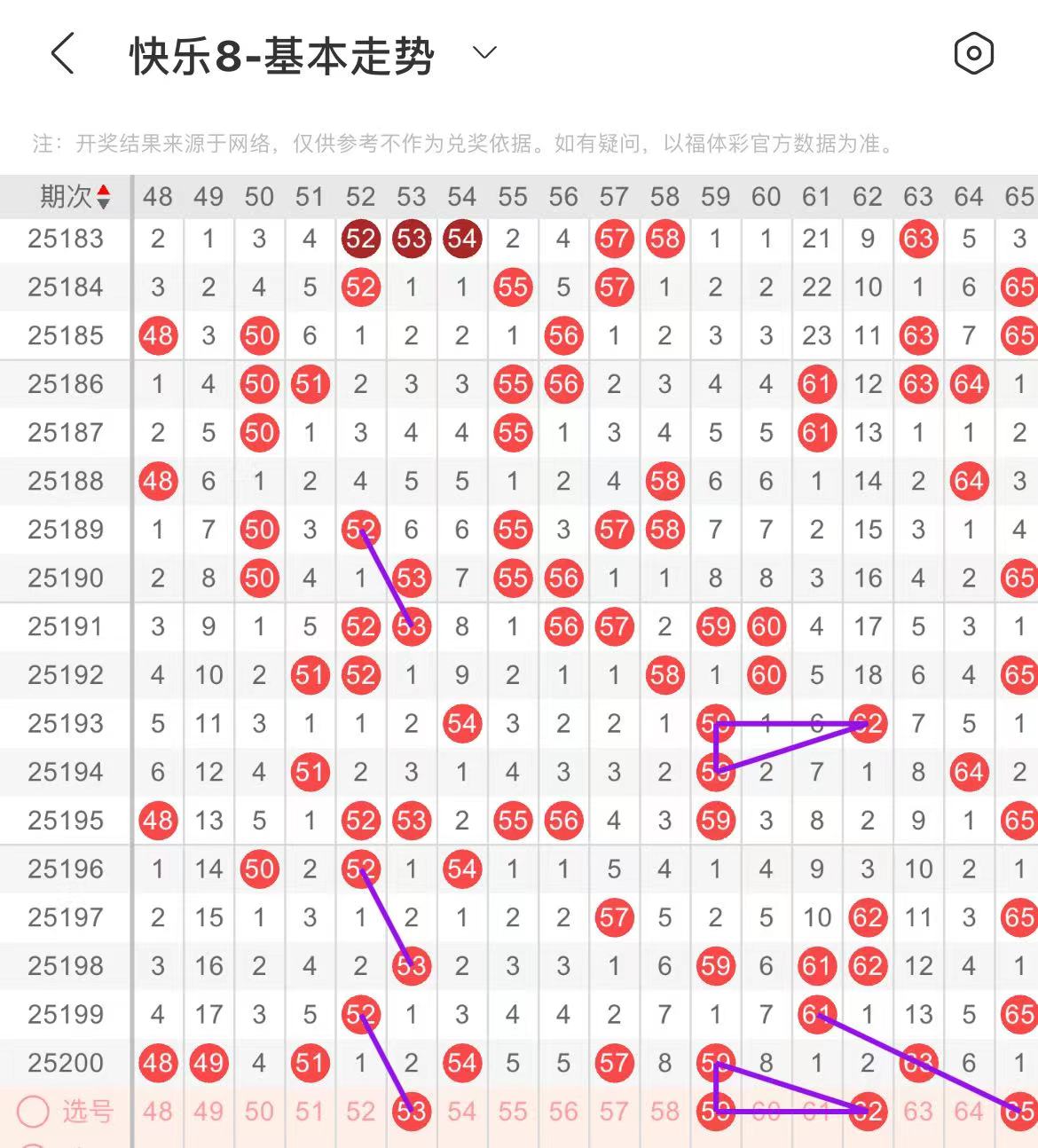 51-60区:本区间上期开出了四个号码,从号码走势图上看,上期出号个数突增,本期注意出号个数有所下降,出号个数应该在两个号码左右,本期有出号走势的号码有53号,52对应开出53号,59号,走重的可能。