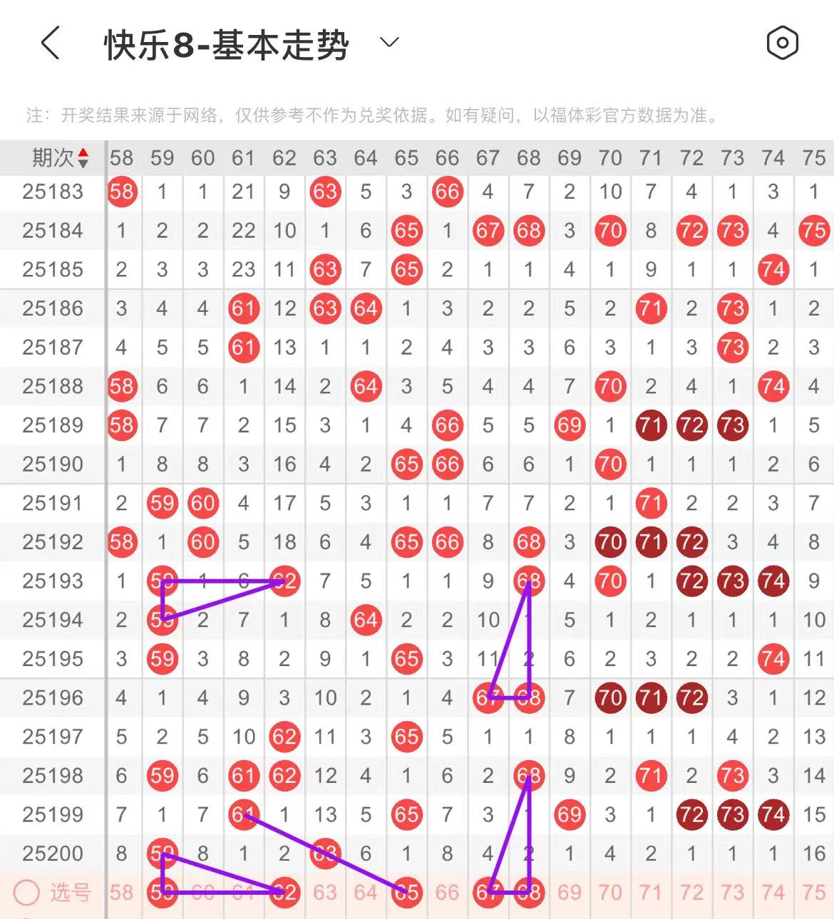 61-70区:本区间上期开出了一个号码,从号码走势图上看,上期出号个数有所减少,本期注意出号有所增加,在选号上可考虑多做选择。本期有出号走势的号码有62号,59对应62出号走势,65号,斜连且隔期相同出号走势,67.68号,形成三角走势形态。