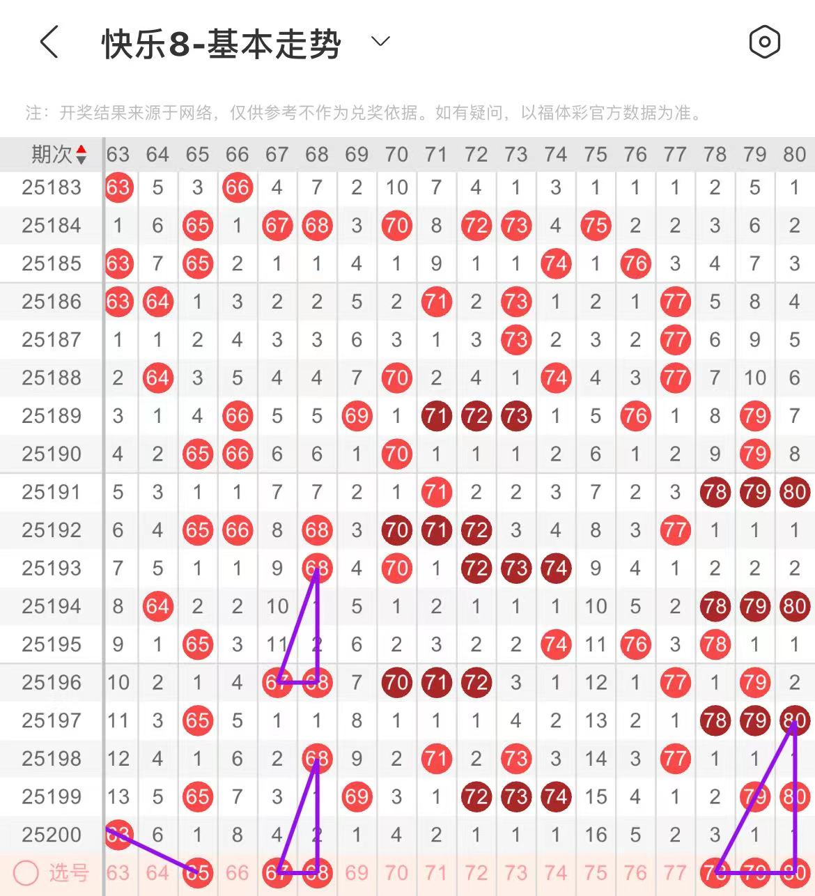71-80区:本区间上期断区了,从号码走势图上看,该区现属于温热区,连续断区的可能性不大,本期注意号码回补,出号个数应该在三个号码左右。本期有出号走势的号码有78.79.80号,形成一个三角走势形态。