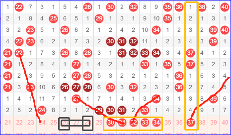 第二区间号码21-40,昨天咱们重点提出了号码30,果然是直接落下,更是带出了29和31形成三连号。至此,二区连号时代结束。那接下来谁又会是下一个二区的霸主呢?是否能够走出四连号,我们到时候一起讨论一下。