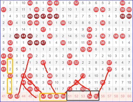 第三区间号码41-60,咱们的防守号出现了两个号码,再继续一期吧,不出就要更换了。尤其是这一期面临着47 48 49 50的冲出来的节奏,303期三区必将是最精彩的一个区间。我们拭目以待今晚它的表现吧!