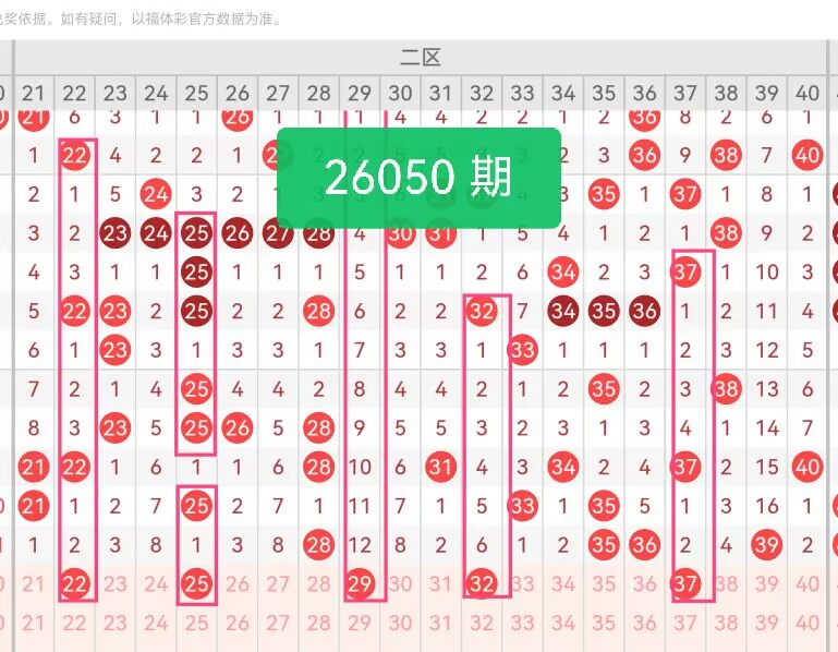 上期第二区间开奖4个号码,本期可能会增加开出。22:二区开头稳号,偶数打底、走势柔和,与上期28形成邻位呼应,作为二区起点号。 25:二区中段活跃号,奇数衔接、位置关键,与22形成合理间距,填补21-30段核心空位,提升区间密度。 29:二区中后段过渡号,奇偶属性均衡,与周边号码节奏同步,承上启下让二区出号更连贯。 32:偶数稳号,落点居中、走势稳健,平衡二区奇偶比例,让区间号码分布更舒展、不扎堆。 37:二区尾段核心号,奇数收尾、衔接三区,与上期35、36、39形成温和过渡。