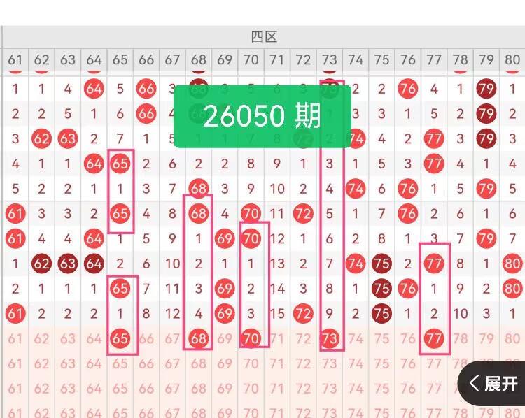 上期第四区间开奖4个号码,本期有望增加开出。65:四区开头核心号,奇数、落点清晰,与上期61、69形成温和衔接,作为四区起点稳定适配。 68:四区中段偶数稳号,走势柔和、位置关键,平衡四区奇偶比例,填补中段关键空位。 70:四区中后段偶数稳号,与68形成偶数联动,作为后端过渡号,让四区出号更流畅。 73:四区后段活跃号,奇数点缀、节奏轻快,与70形成合理间距,覆盖四区后半段核心位置。 77:四区尾段收尾号,奇数收官、填补尾段空档。