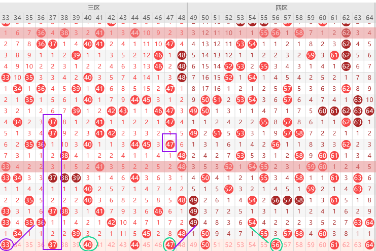 三区胆尾7尾,三区7尾一直隔二期出一期上图已勾画,那么本期笃定有7尾,37 47二出一,47是边号看好47,不喜欢47试试37,上期重号断了如果本期回补看45,边号33 35 38 40 44 46 47出2个,33形态比较好看,上图已勾画,本期注四码33 40 45 47