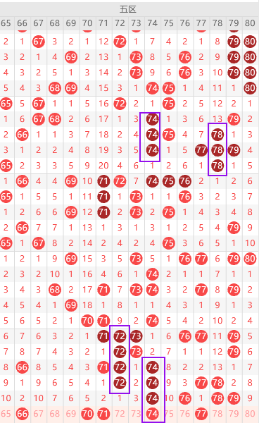 五区看好4尾,7尾,9尾,形态上面有几次出4直落连续出,本期重号看74,79,边号没断本期边号73 75 77 78 79 80出一码,看好77,6开头近期不出号,防一下69,本期有9尾79 69 二出一,本期关注五码69 71 74 77 79