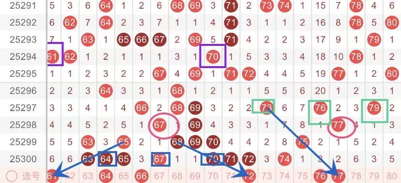 上期四区开号八码,主要以三连码和分边形式开出。本期考虑开号四码左右,首先看61与70同路放空位置考虑61号球直接落号补位,防守分边62号球。然后看64、67、70同路主要考虑64重号,防守66号球。再看67、77同尾放空考虑分边76号球,防守77直接落号补位。最后看斜三连的72号球有机会下落。