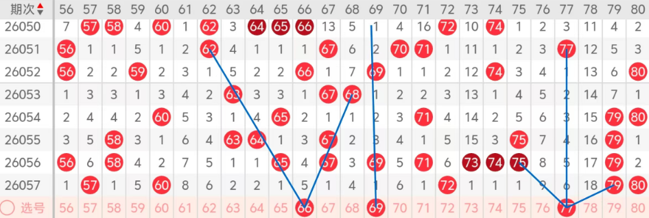 第四区间的走势分析:第四区间上期开出了三个号码球,主要的落号点位在四区间的后半区,走出了一奇两偶的形态走势,上期四区间的前半区没有号码球落下,后半区落下了三个号码球,整个四区间处于走冷的趋势,根据四区间的走势规律,今天的四区间我们主看冷码的回补,前半区主看66 69这两个号码球的落位,也是热码组合,今天落下的机会很大,再看后半区77的回掏,注意66 77的组合,这三个号球建议大家打个三胆拖,或者打个三码复二比较稳妥,参考为主!