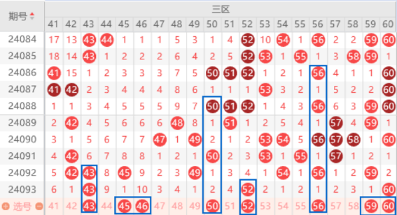 本期的40 43号数字我们注意出一个三重的情况,重点关注一下43号数字出三重的情况。本期的46号数字是属于遗漏10期的号码,本期遗漏10期的号码有2个,本期我们做注意出一个号码的情况,这里我们可以关注一下45 46号数字同出的情况。本期的50号数字也是属于空二对称号码,可以关注一下。本期的56号数字本期我们也是要注意的,出号机会还是有的。本期的59号数字是属于1221走势,和60号数字的走势是一样的,我们要注意一下。