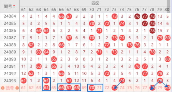 上期开出了61 64 67号数字,本期我们注意一下出一个重号的情况,我们关注一下64号数字的出重的情况就行了。本期的68 69号数字都是冷号,本期我们注意一下出一个号码的情况。上期开出了74号数字,本期我们注意一下走分边的情况,重点关注一下73号数字的出号情况。上期开出了79号数字的重号,本期我们注意一下78 80号数字出一个号码的情况,重点关注一下78号数字的出号情况。