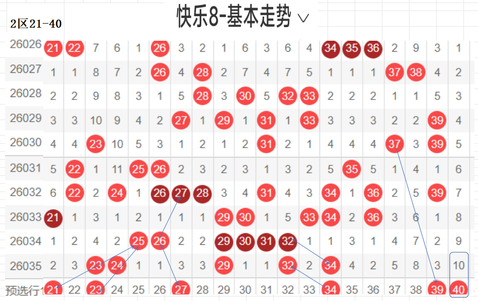 二区(21-40):遗漏5期以下有18,021 23 27 34 39 40  5,数据所示,冷码平均,选择条件增多了.上期开出了5个号码,出码比较分散.这期布防相应增加,重码按比例落这区较少,先给出关联码27,这个区间间接走势,温区,21-30区间上期开了3个,依旧不是重点选号区间,31-40区间开出3个,本期关注热码的回补,间隔小遗漏值最佳,3字头转热,这个小区热码注意回调,可以做关联码的布局,注重温冷码的回补.