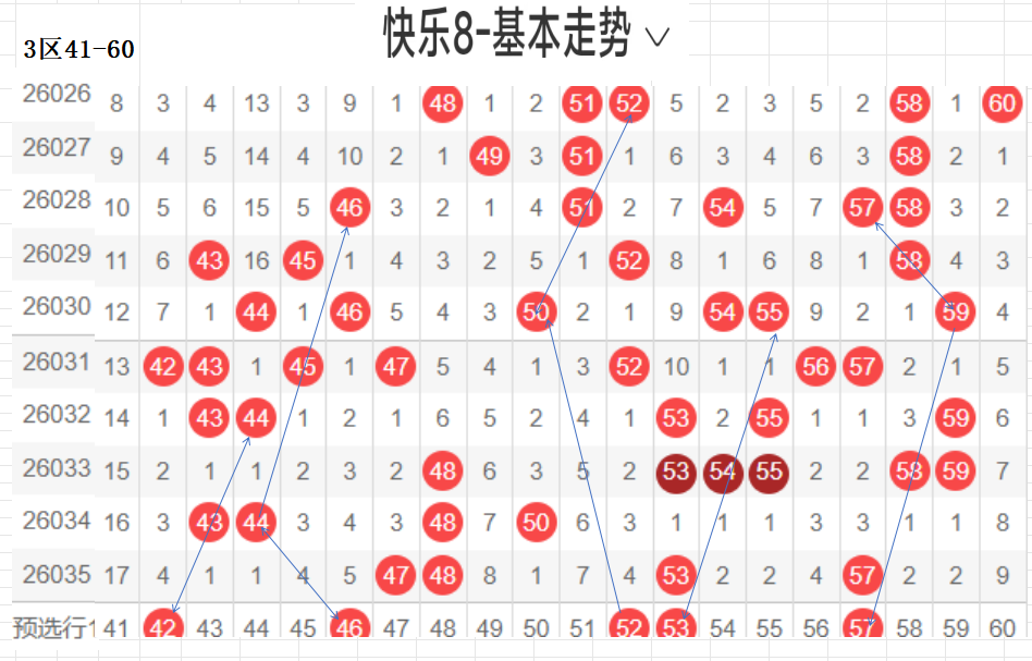 三区(41-60):遗漏5期以下有16,047 48 53 57  4,温开方式,这区码数有回暖之意,可以防一手,先定胆码走势较大者,隔期,斜三连,分边号码,可重防,间隔5以上号码可以随走势选取,例如本期大冷码,走势比较大,可以做胆,通常联动可带出,分边对称的号码,本区间也有很大走势.可关注下.隐形夹角号码.做补位形态号码.都需要观察动态走势.以上是本区间的选码方法.