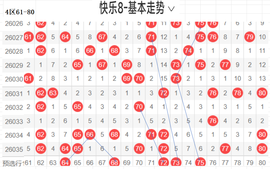 四区:(61-80):遗漏5(5)以下有16,062 64 65 70 72 77 80  7,平均温开方式,上期开出7,区间回暖,后区可防,区间从以往数据来看,重码很强,一枝独秀的存在,近期有回补走热的趋势,区间回暖,本区间后区可防,与一区相比,也是温区.,对称下落,隔期回补码,可以防,这区对呈对称三角关系的胆码,斜三连有走势的胆码,联动落位码,都有各自的走向落位关系,根据走势选择一种方式选码.
