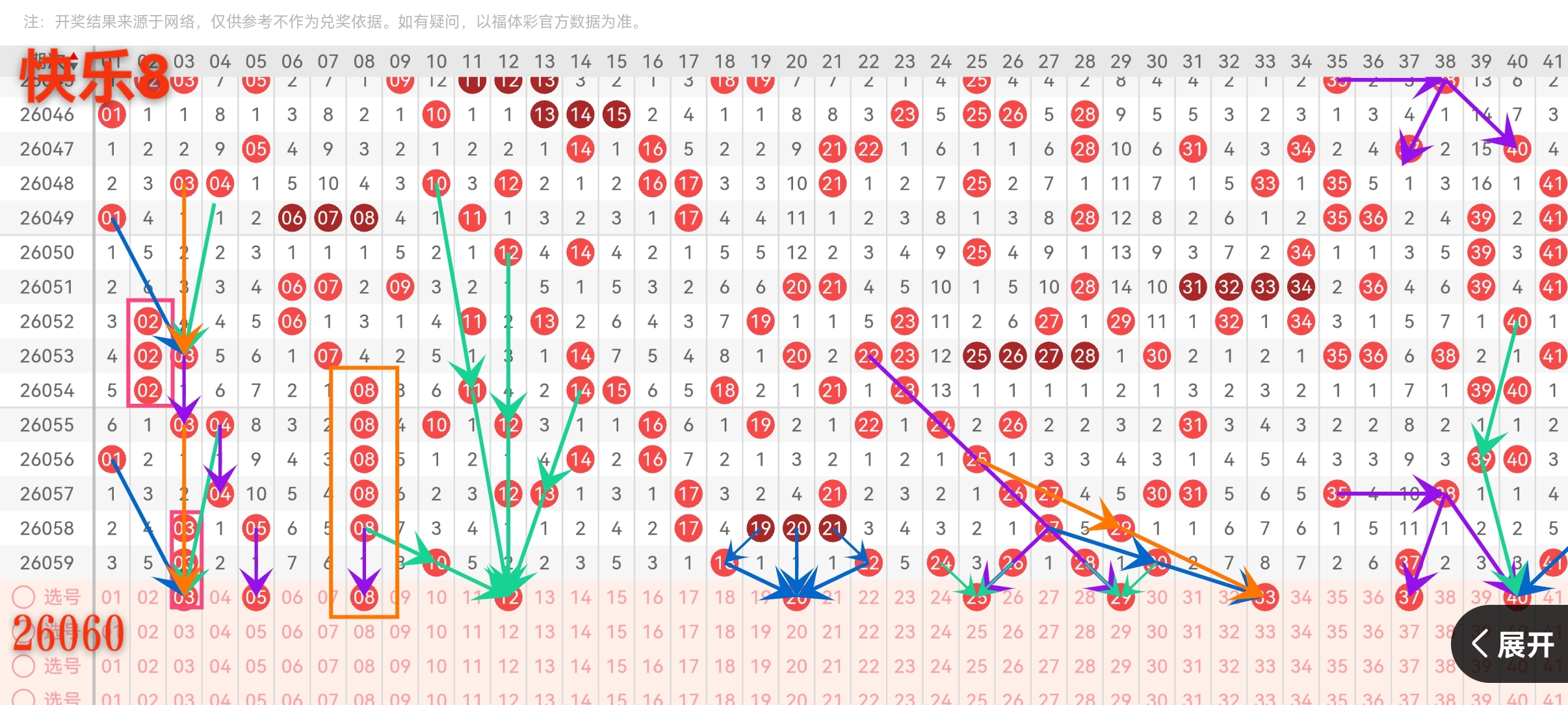 03:上期刚开过03。在快乐8里一个号连着开两期三期不算稀奇,这叫重复号。03是个小号,最近一区小号出得还算稳定,它有可能像上面三期2一样再来一次。个人觉得03值得放进来防一手。