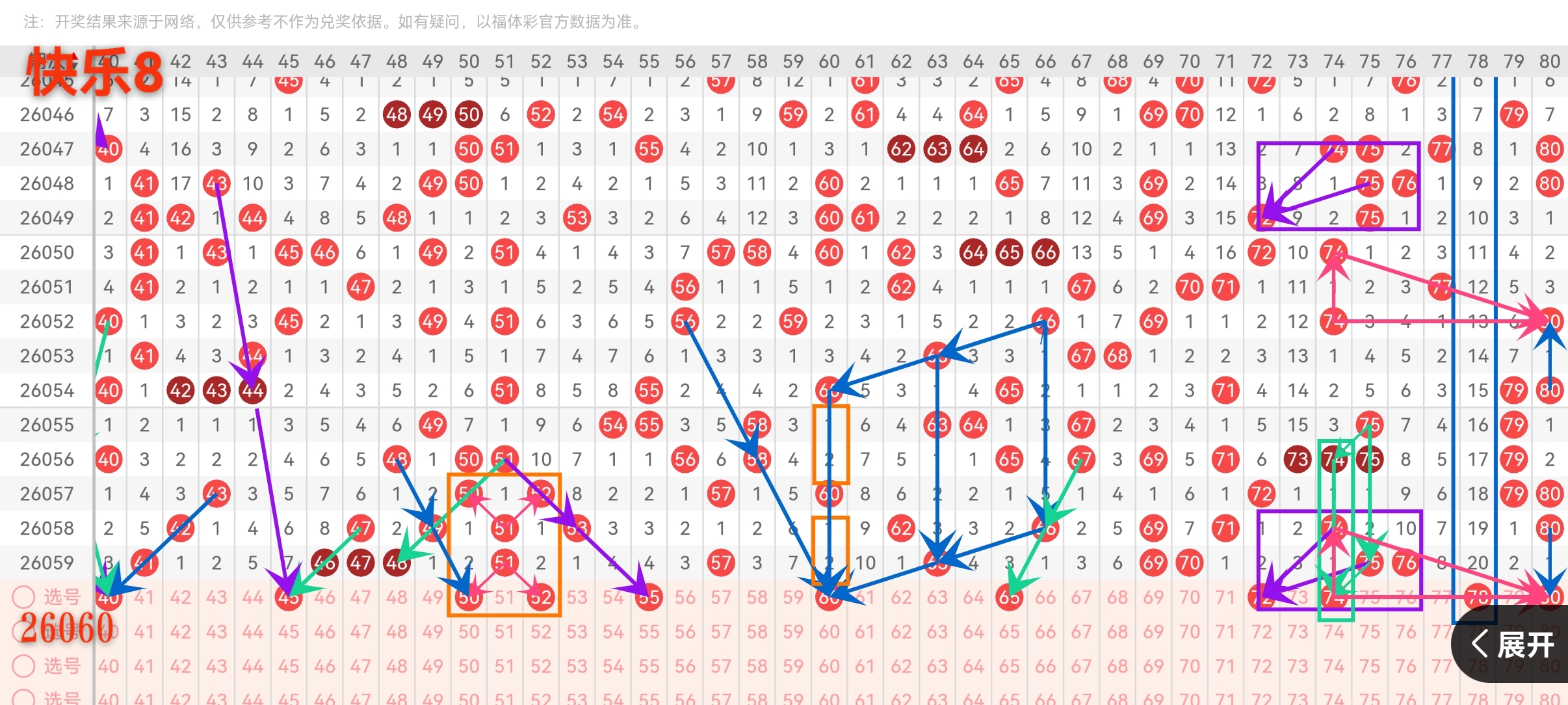 80:80是四区最大的数,也是整个快乐8的龙头老大。最大号永远有它的吸引力,时不时就会开一次来证明存在感。尤其当四区整体不算太冷的时候,80完全有可能压轴出场。