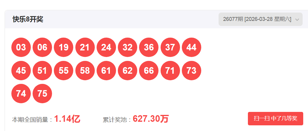 一、快乐八2026077期开奖号码
