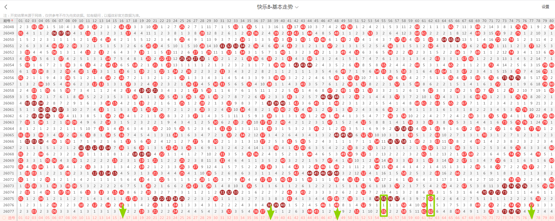 从这张走势图可以看到绿色方框标出来了遗漏一期的示意号码,开出了隔期(遗漏一期的)2个号码(绿色方块标示的),数量与上期减少,从近期走势图看隔期码回温态势形成,本期判断热度继续回温,落号4个号码概率较大(绿色箭头标示的16、38、48、77)需要关注,有下号概率;