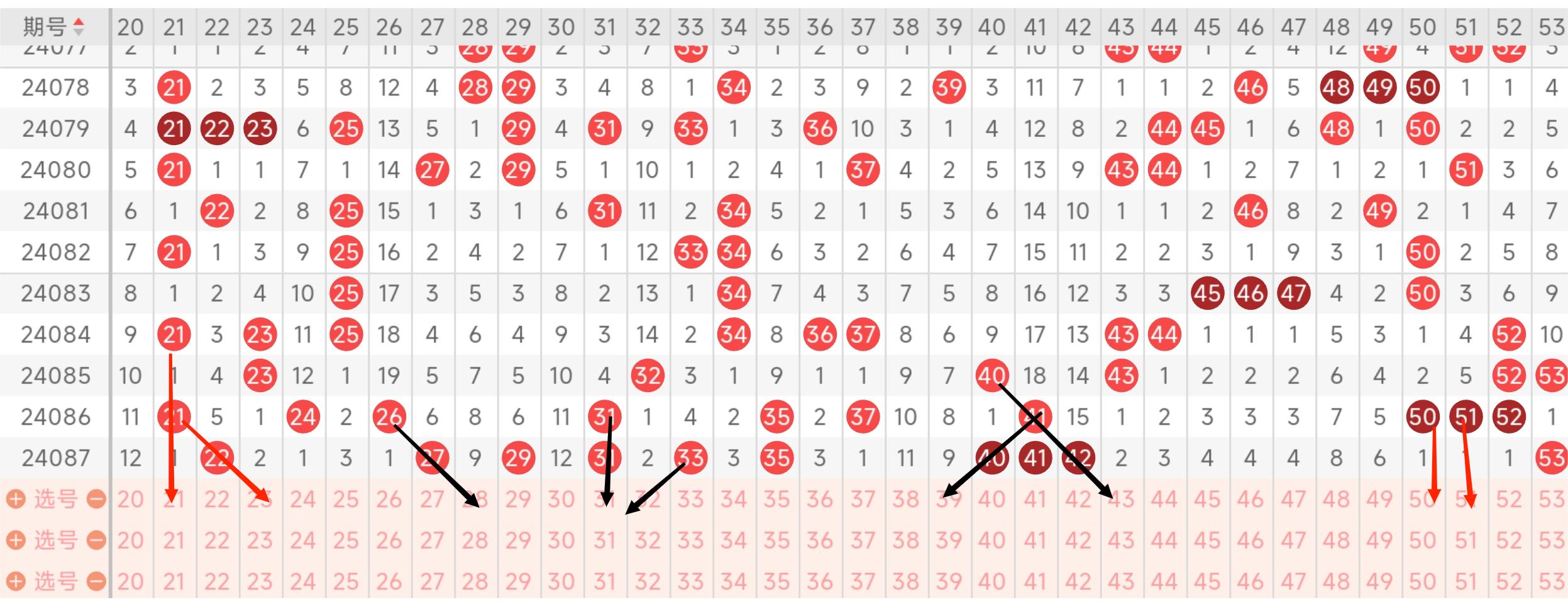 区间分析:24086期开出六个号码球的走势和24087期开出四个号码球,三区的连出走势有号码球41号球和号码球60号球在这二期是二连出走势和斜开奖走势开出号码球42号球和号码球53号球,本期注意斜开奖走势开出号码球43号球和预防号码球42号球的二连出走势和注意号码球54号球的斜开奖走势开出和预防号码球50号球和号码球51号球的遗漏一期开出走势和注意号码球56号球的遗漏一期开出走势(24080期-24086期是遗漏一期开出走势)