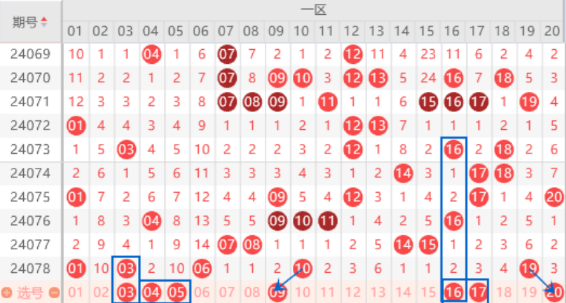 上期开出了01 03号数字,本期我们注意一下出一个重号的情况,重点关注一下03号数字的出号情况。本期的04 05号数字我们要注意出一个号码的情况,重点关注一下05号数字出号情况。本期的07 09号数字我们也是要注意出一个号码的情况的。本期的16号数字是属于空二对称号码,本期我们防守一下16 17号数字同出的情况。本期的20 30 40号数字我们要重点关注了,本期是有很大机会要出一个了,可以在这里定一胆码。