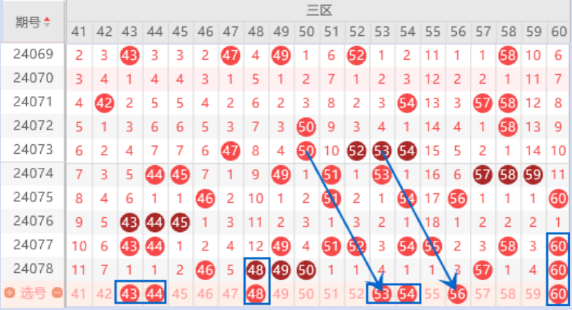 本期我们注意一下43 44号数字落下一个号码的情况。上期开出了46 48 49 50号数字的连号空一带号,本期我们要注意出重的情况,重点关注一下48 49号数字出一个重号的情况。本期的53 56 59号数字我们要注意出号情况,本期是可以在这里定一胆码出来的,重点关注一下53 56号数字的出出号情况。本期的60号数字我们注意一下出现三重的情况,可以做一下防守的。
