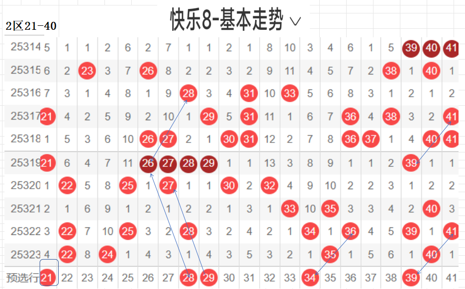 二区(21-40):遗漏5期以下有18,022 24 35 40  4,数据所示,冷码平均,选择条件增多了.上期开出了4个号码,出码比较分散.这期布防相应增加,重码按比例落这区较少,先给出关联码34,这个区间间接走势,温区,21-30区间上期开了2个,依旧不是重点选号区间,31-40区间开出2个,本期关注热码的回补,间隔小遗漏值最佳,3字头转热,这个小区热码注意回调,可以做关联码的布局,注重温冷码的回补.