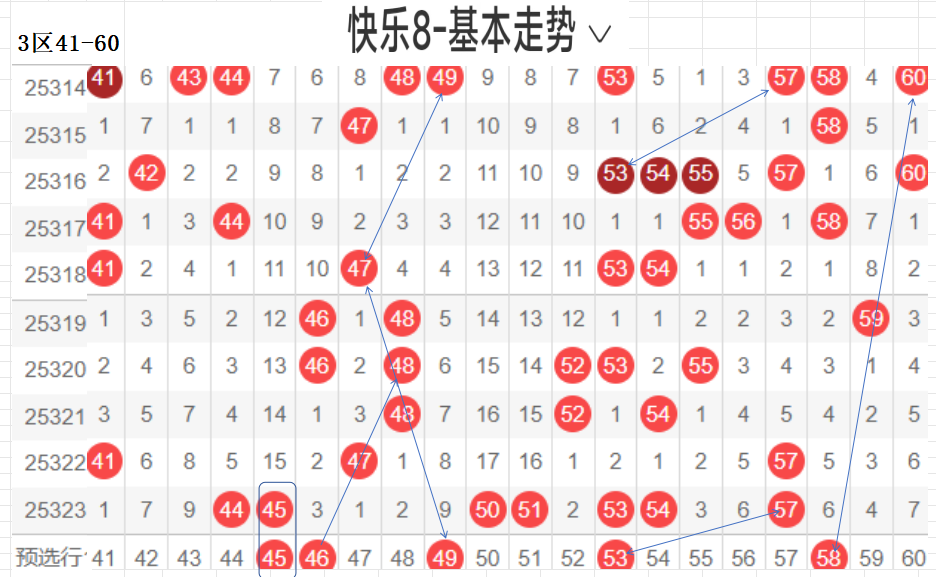 三区(41-60):遗漏5期以下有14,044 45 50 51 53 54 57  7,温开方式,这区码数有回暖之意,可以防一手,先定胆码走势较大者,隔期,斜三连,分边号码,可重防,间隔5以上号码可以随走势选取,例如本期大冷码,走势比较大,可以做胆,通常联动可带出,分边对称的号码,本区间也有很大走势.可关注下.隐形夹角号码.做补位形态号码.都需要观察动态走势.以上是本区间的选码方法.