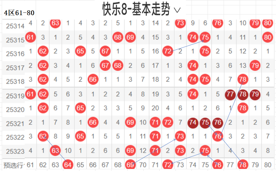 四区:(61-80):遗漏5(5)以下有15,063 69 71 73 75  5,平均温开方式,上期开出5,区间回暖,后区可防,区间从以往数据来看,重码很强,一枝独秀的存在,近期有回补走热的趋势,区间回暖,本区间后区可防,与一区相比,也是温区.,对称下落,隔期回补码,可以防,这区对呈对称三角关系的胆码,斜三连有走势的胆码,联动落位码,都有各自的走向落位关系,根据走势选择一种方式选码.