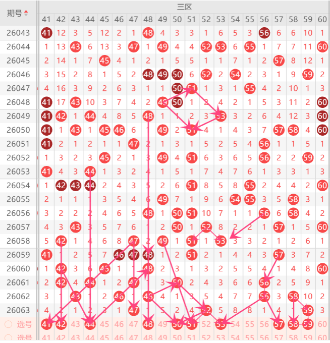 而三区的打底号是42.46.48950.52.54.55.58.59.60中参考3-4码开出机会,