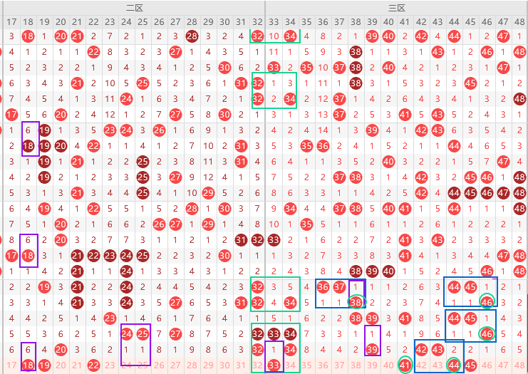边号19 21 31出一码,重号20 32防守,二区上期开出2码,遗漏值18可以关注,跟上面一样,其次就是边号19,算周期1开头断多期,本期18 19有概率出连号,遗漏值24 25 27应该要回补一码,2尾出2期,防22,20不走重防30,关注五码18 19 20 25 31防23,一胆19双胆19 23