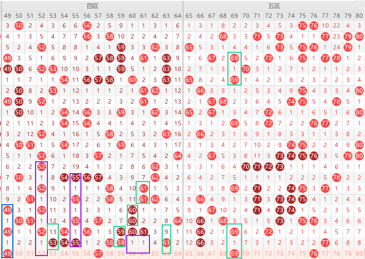 边号65 67 76 78出一码,重号66 77防守,最近几期开出2-3码,不建议在五区选号,可以等热了马上跟一期,本期69喜欢遗漏一期出,73是斜连号,防80,关注五码66 67 73 77 80