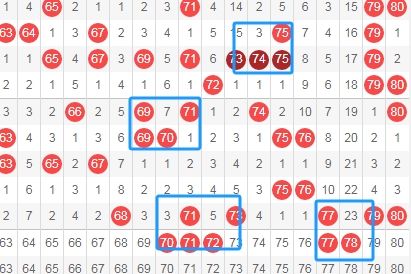 上图是福彩快乐8开奖号码走势分布图其中一部分,我在上面标注出来的蓝色小框框表示相似的地方,假设出连号7778这里组成的框框很上面的数字6970是不是很相似呢?假设同样出连号707172这里组成的图形是不是和上面的6970,737475这两个地方组成的图形相似?根据相似的地方去推号码。