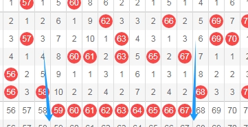 上图是福彩快乐8开奖号码走势分布图其中一部分,我在上面标注出来的蓝色小框框表示相似的地方,假设开出数字57 58 59那么这里组成的蓝色框框图形和上面两个标注出来的蓝色框框是不是很相似呢?因为上期开出的连号少,所以本期多看连号。