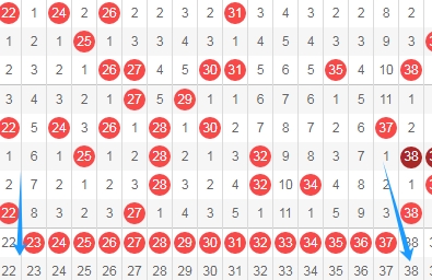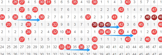 上图是福彩快乐8开奖号码走势分布图其中一部分,我在上面标注出来的蓝色箭头是不是很相似的图形呢?假设开出数字33 34 36 38是不是和上面横向蓝色箭头标注出来的地方相似?这是根据最近开奖号码组成的特点来选号码。